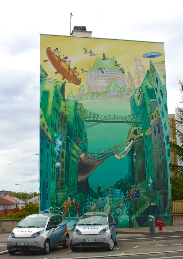 Unsere Reise durch die Stadt führte uns als nächstes zu einer Wandmalerei mit eben diesem Namen, das passenderweise auch noch an der Rückwand eines Busdepots zu finden ist und Szenen aus dem öffentlichen Personenverkehr Lyons im Wandel der Zeiten zeigt.