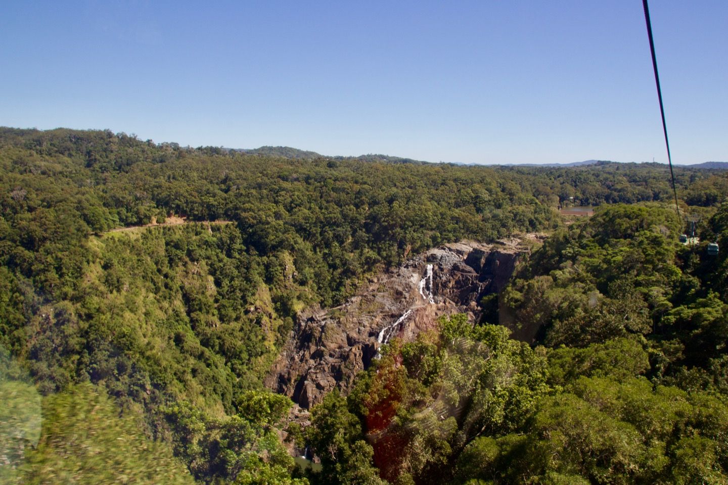 Die Seilbahn fährt über den Regenwald (und die Bahnstrecke) und ermöglich aus den Kabinen und von einer der Zwischenstationen Blicke auf die beeindruckenden Barron Falls. Im Hintergrund, auf der anderen Seite der Fälle, ist die Zwischenstation der Eisenbahn zu sehen.