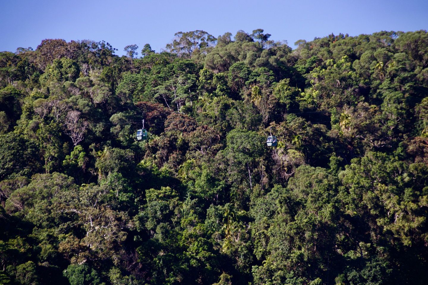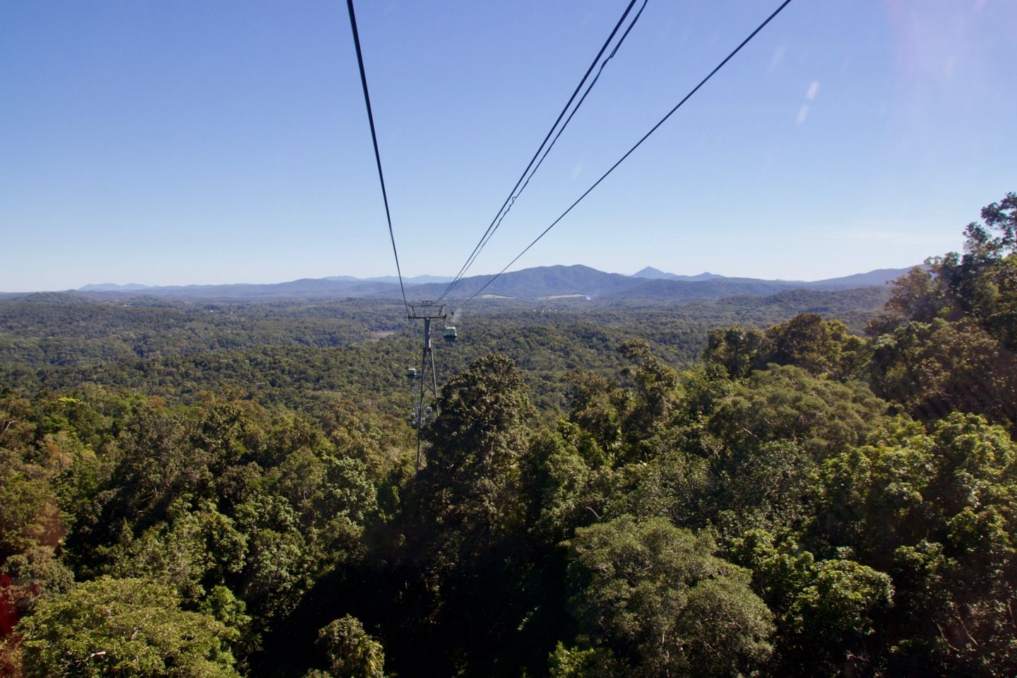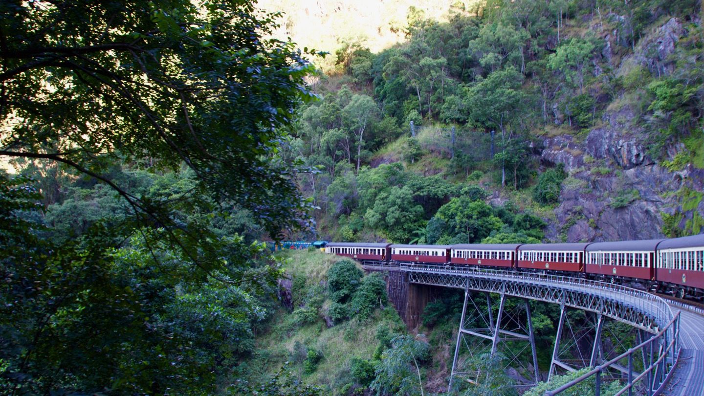 Den Weg von Darwin nach Cairns mussten wir leider mangels Bahnstrecke mit dem Flugzeug zurücklegen. Von Cairns aus gibt es viele touristische Möglichkeiten, zum Beispiel kann man am Great Barrier Reef schnorcheln oder aber mit Seilbahn oder Zug nach Kuranda fahren. Wir wählten für den Ausflug nach Kuranda eine Kombination aus der Seilbahn für die Hinfahrt und dem luxuriösen Zug der Kuranda Scenic Railway für die Rückfahrt.