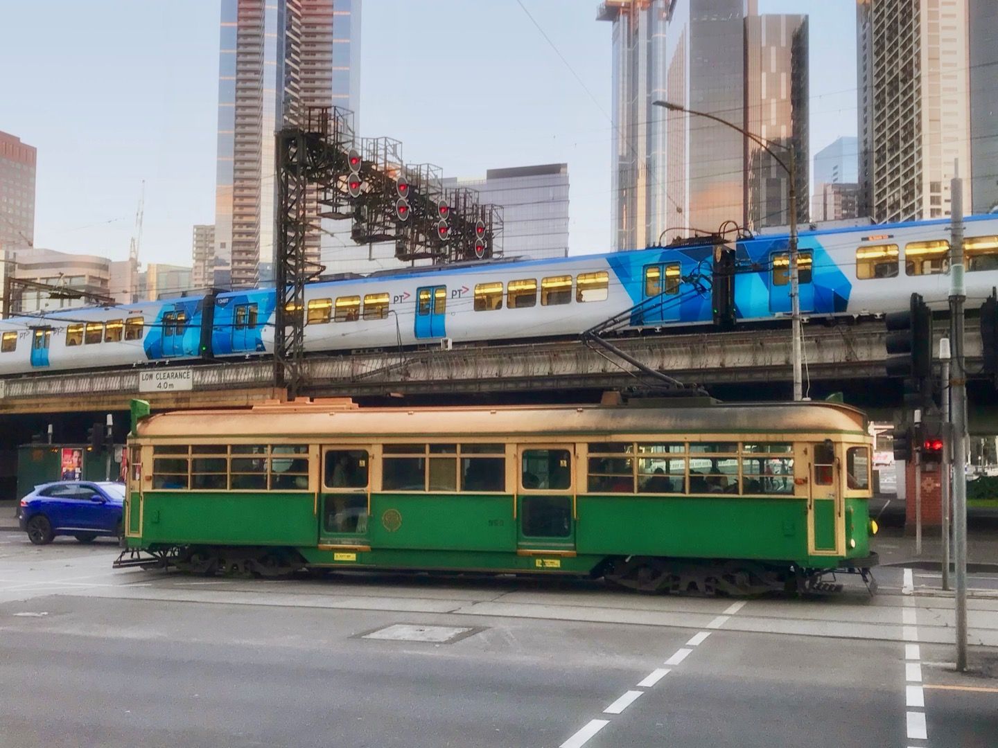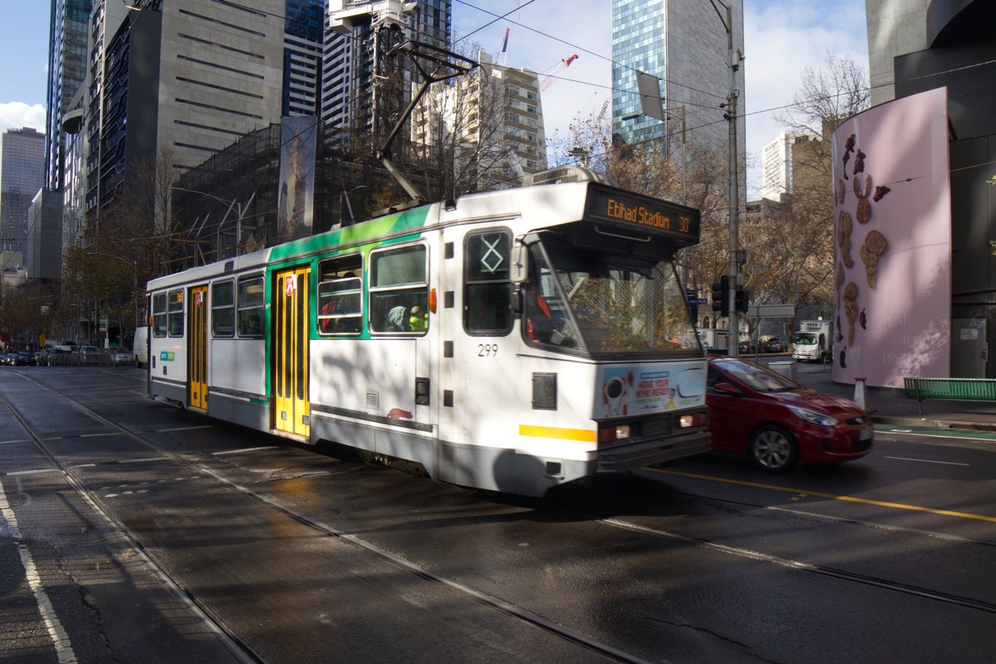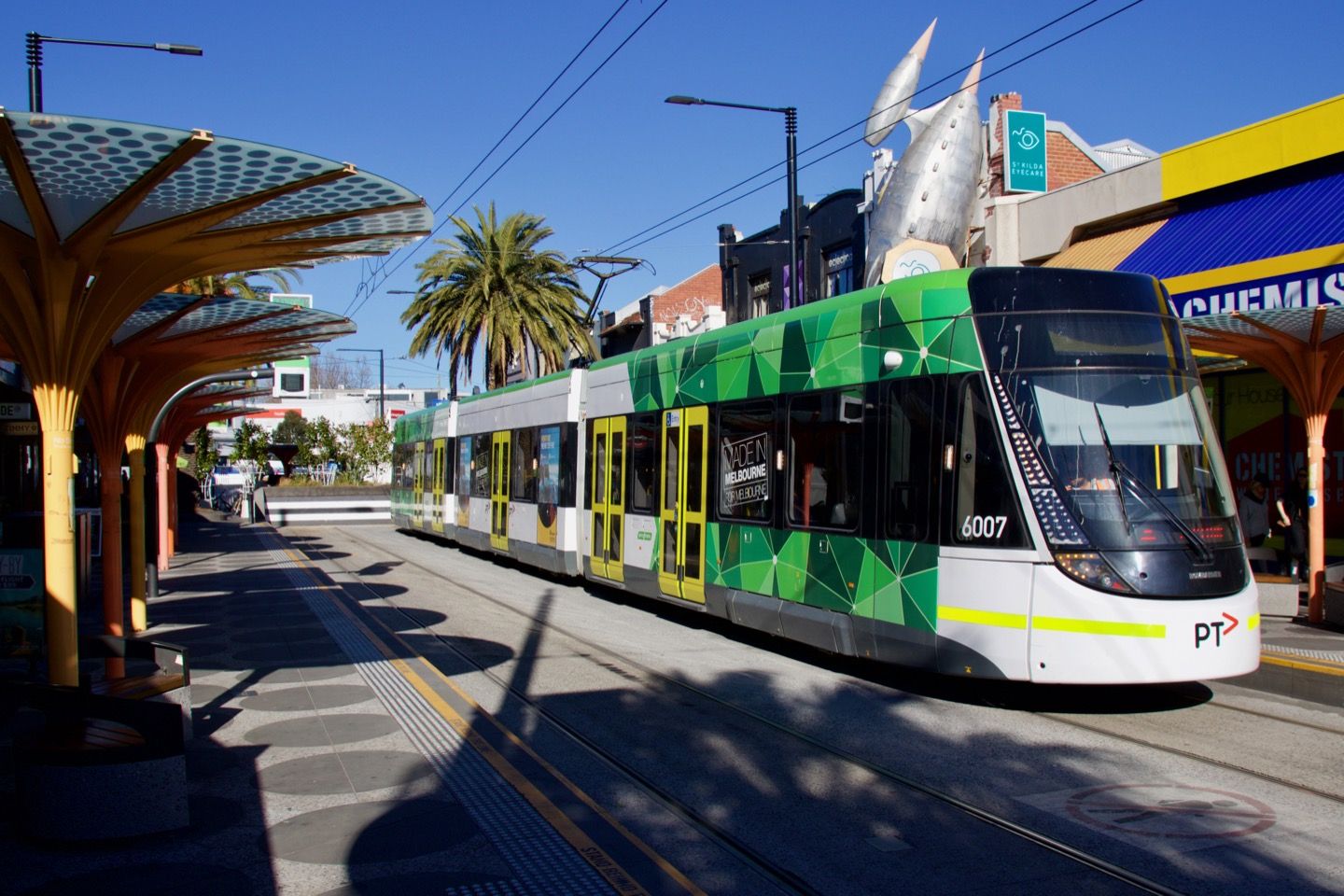 Modernere Bombardier-Triebwagen fahren zum Beispiel über eine zur Light Rail umgebaute ehemalige Bahnstrecke in den Vorort St. Kilda.