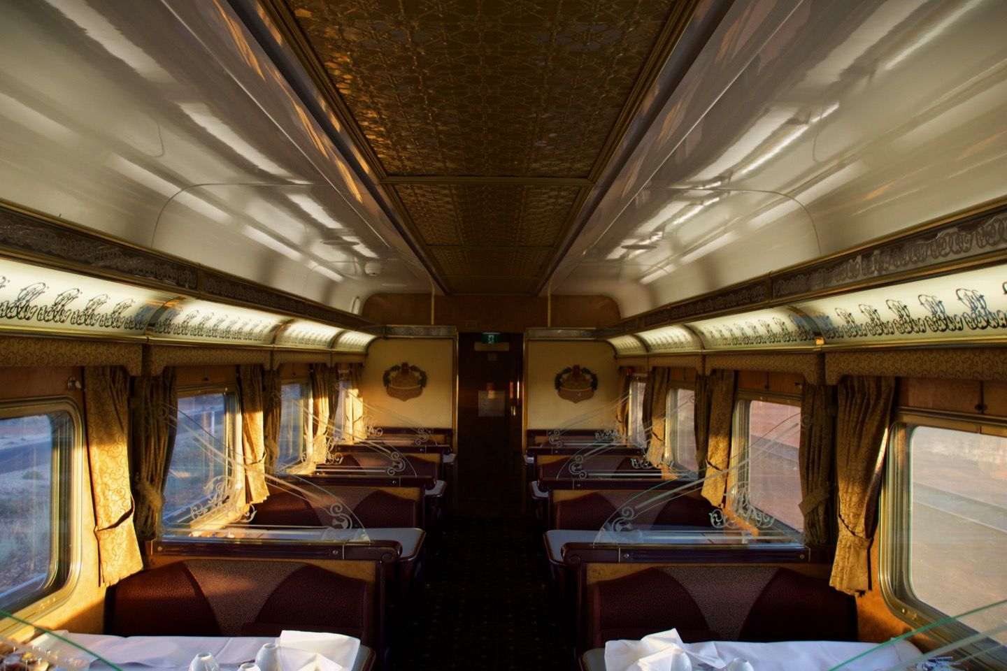 Eine Innenansicht eines Speisewagens (der Ghan führt mehrere davon mit) und eines Zweier-Abteils der Gold-Klasse in Tagstellung.