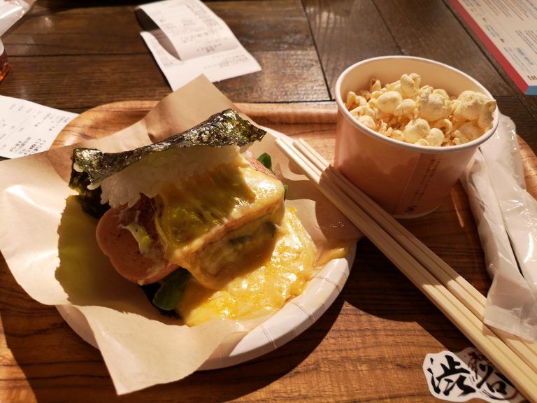 Leberkäse-Onigiri mit Käse überbacken