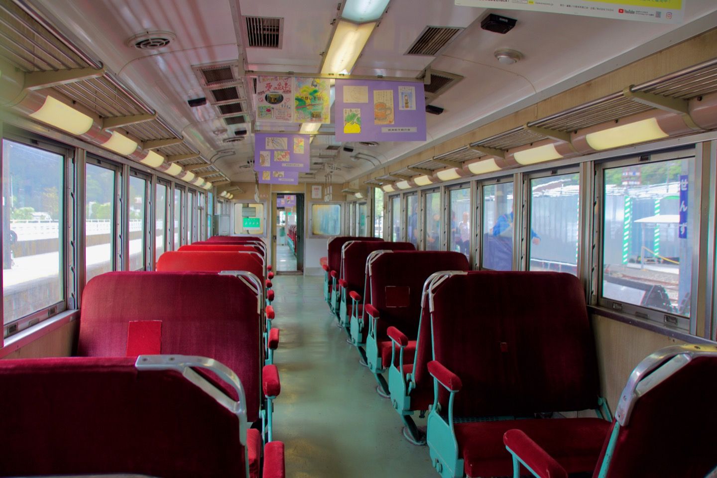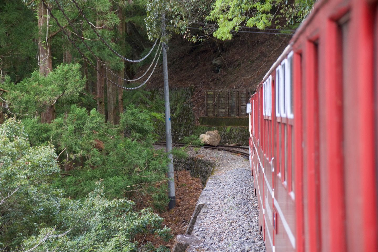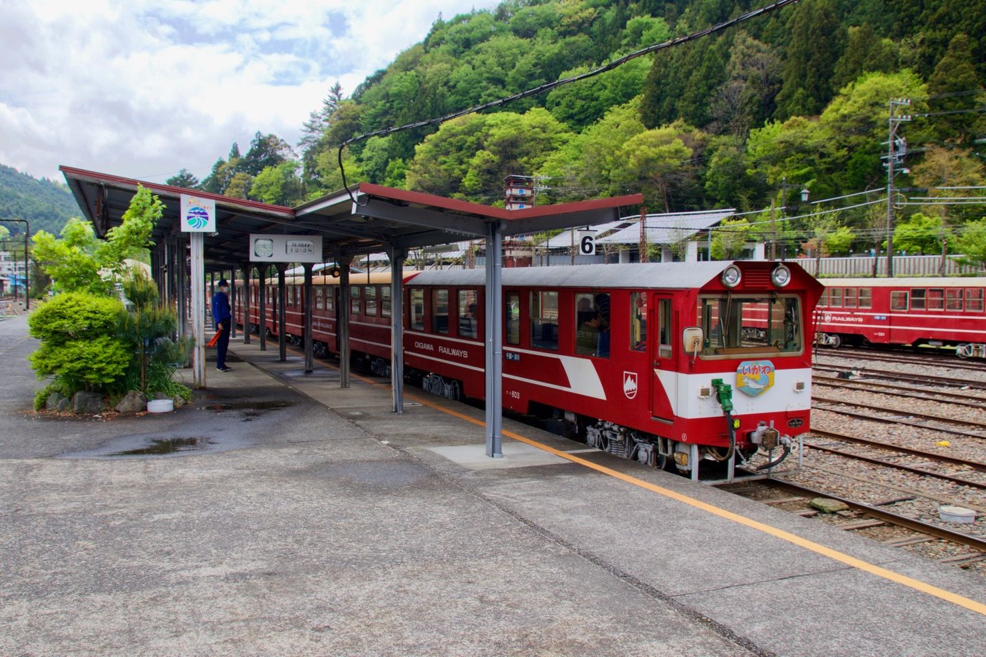 Die Oigawa Railway ist bekannt dafür, dass sie auch täglich verkehrende Dampfzüge betreibt (sowie gelegentlich auch Züge mit einer besonders „verzierten“ Dampflok, über die hier der Mantel des Schweigens gedeckt werden soll). Wir nahmen aber einen normalen Lokalzug, der mit einem zweiteiligen Elektro-Triebzug gefahren wird, der allerdings auch schon über 60 Jahre auf dem Buckel hat.