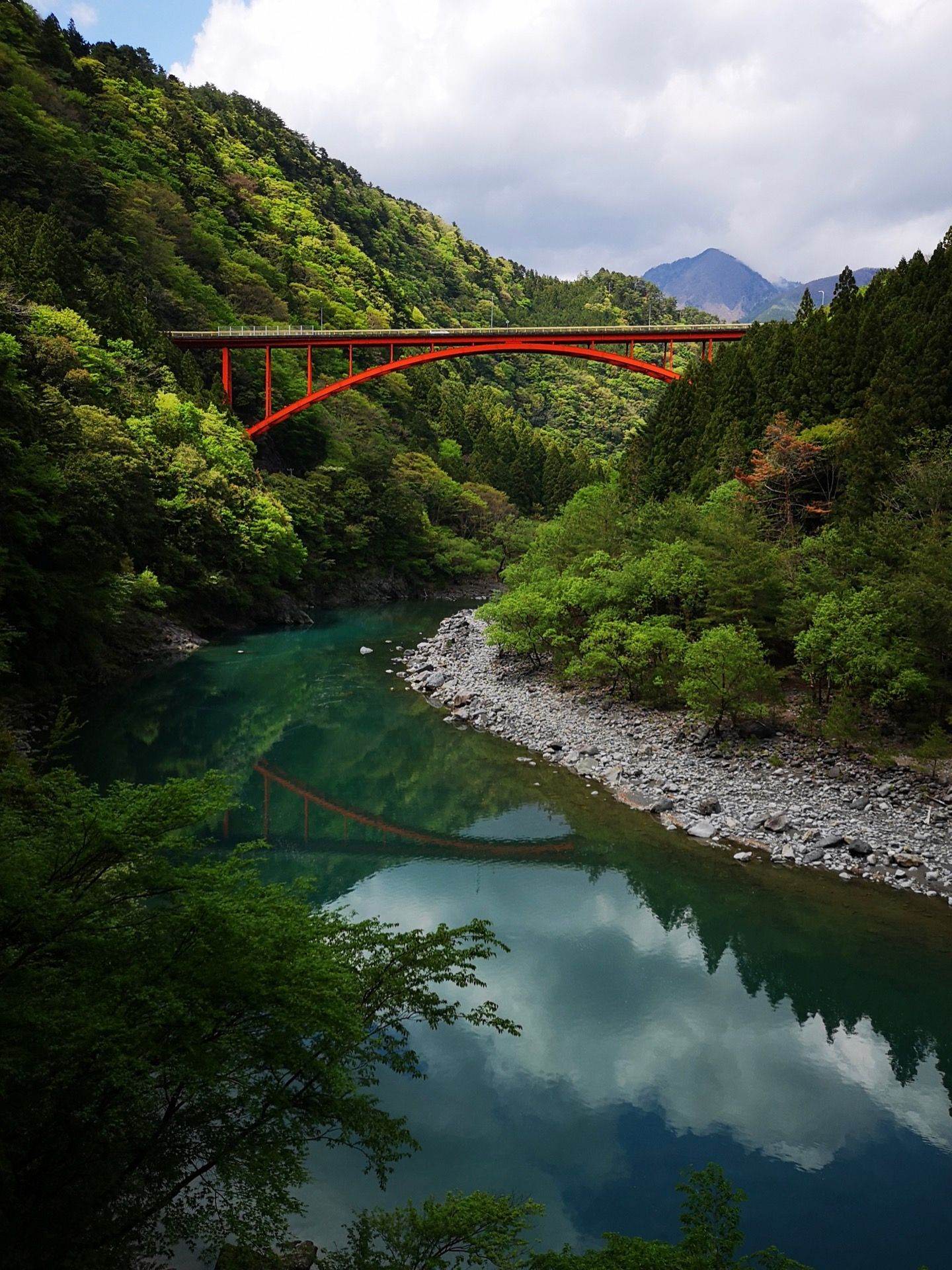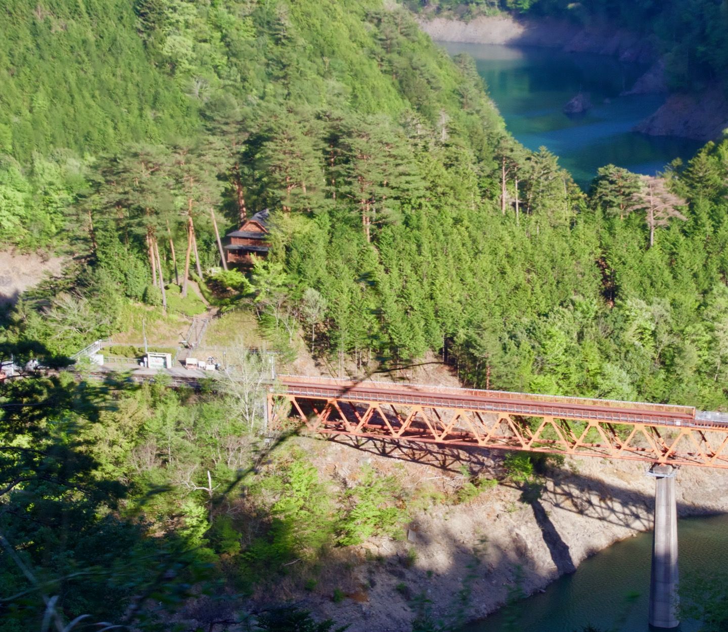 Kurz danach wurden wir dann mit allen Fahrgäste der beiden Züge von einem Bus abgeholt. Die Züge waren an diesem Tag nur sehr schwach besetzt, von daher reichte ein Bus locker aus. Auf dem Weg nach Senzu konnten wir die Okuoikojo-Brücke dann noch einmal von oben sehen. Leider ist das Foto aus dem Busfenster nicht so recht gelungen, daher ist das eher als dokumentarisch zu verstehen.