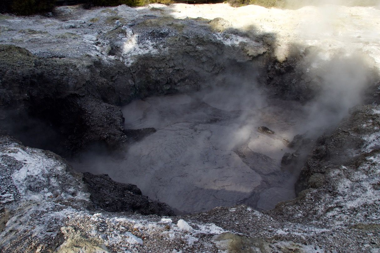 Wir wollten aber noch mehr Schwefel und sind deswegen beim zweiten Besuch erst mal nach Waiotapu gefahren. In der Maori-Sprache steht das ungefähr für „heiliges Wasser“. Dort wird man dann erst mal von einer Reihe von dampfenden Kratern begrüßt.