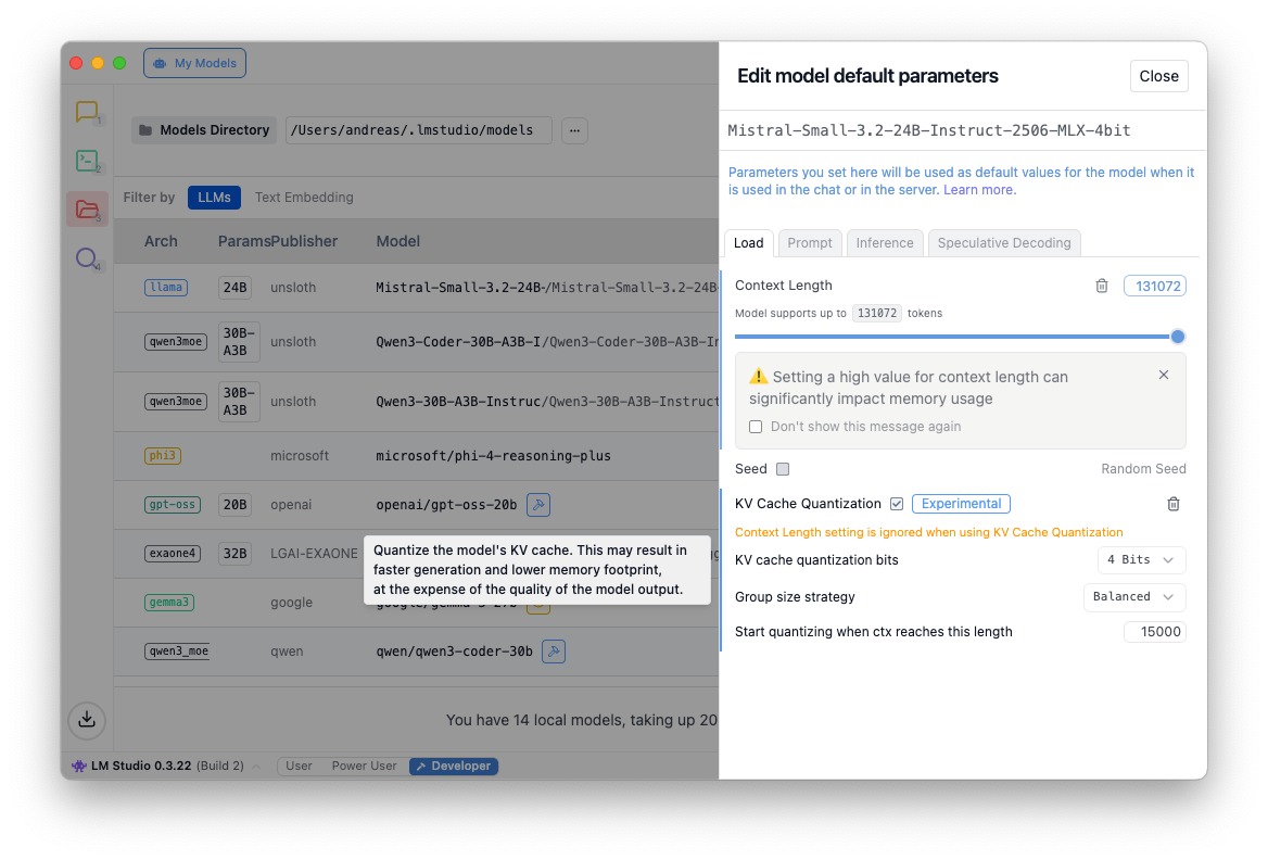 Bei allen Modellen ist darauf zu achten, dass die context length hoch gedreht wird (z.B. bei LM Studio ist sie standardmäßig bei lediglich 4096 Tokens) und, damit das Speicher-Limit nicht gesprengt wird, Flash Attention und Cache Quantization aktiviert wird. (Den Hinweis, dass die Einstellung Context Length ignoriert wird, wenn KV Cache Quantization aktiviert wird, kann man übrigens selbst ignorieren… Wenn Context Length nicht trotzdem erhöht wird, werden große Prompts nicht akzeptiert.)