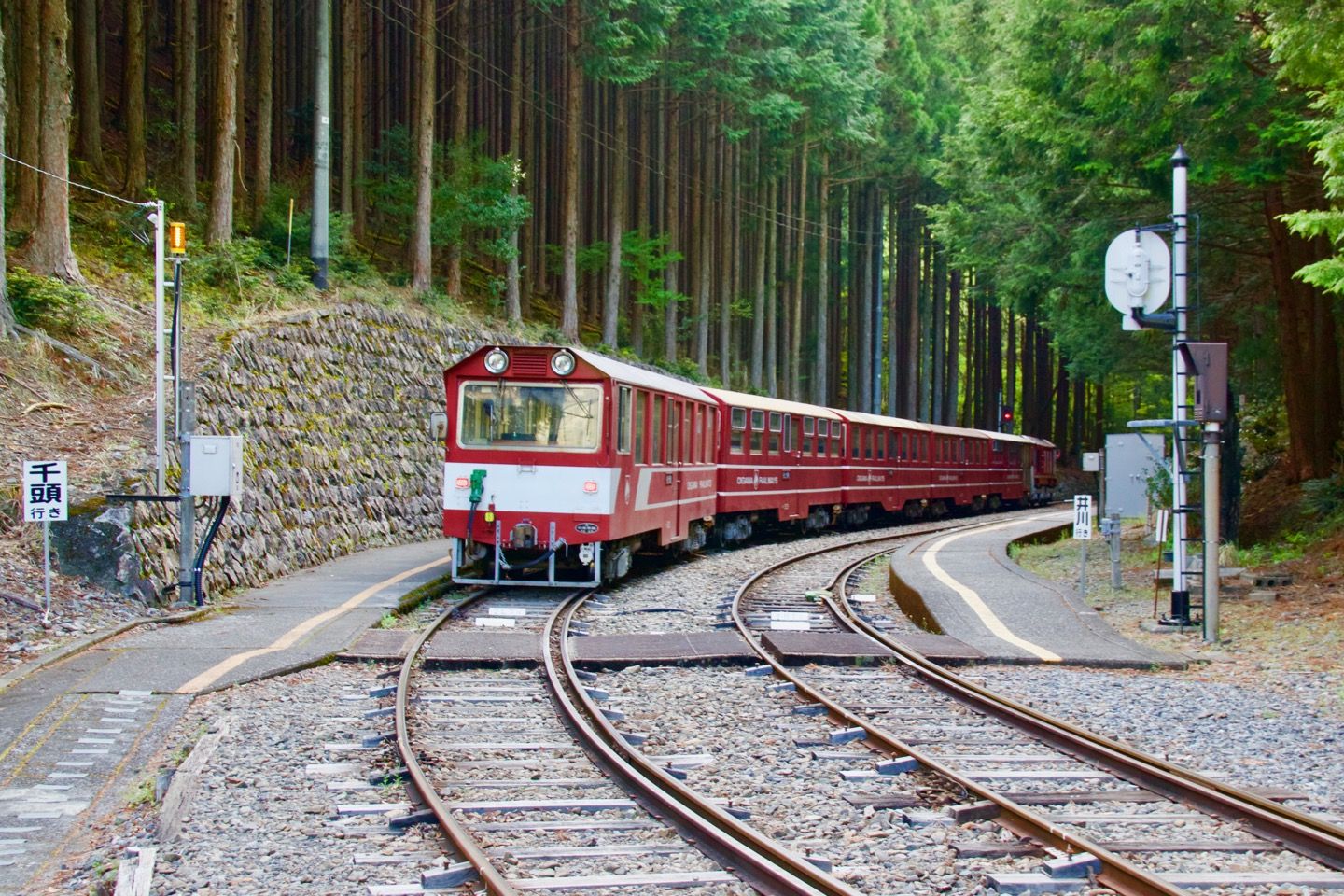 Die Oigawa Railway ist bekannt dafür, dass sie auch täglich verkehrende Dampfzüge betreibt (sowie gelegentlich auch Züge mit einer besonders „verzierten“ Dampflok, über die hier der Mantel des Schweigens gedeckt werden soll). Wir nahmen aber einen normalen Lokalzug, der mit einem zweiteiligen Elektro-Triebzug gefahren wird, der allerdings auch schon über 60 Jahre auf dem Buckel hat.