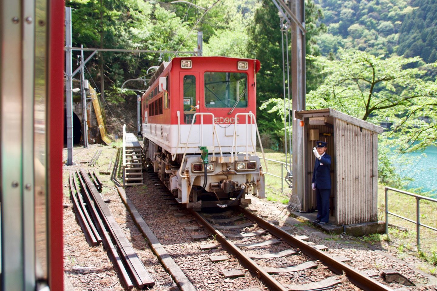Direkt nach Ankunft im Bahnhof Nagashima Dam wird die E-Lok wieder abgekuppelt. Sie übernimmt den wenig später eintreffenden Gegenzug zur Talfahrt.
