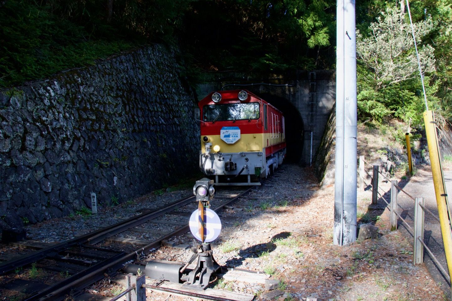 Die Züge der Ikawa-Linie sind mit Dieselloks bespannt. Wie es sich für eine Steilstrecke gehört, befindet sich die Lok stets auf der Talseite.