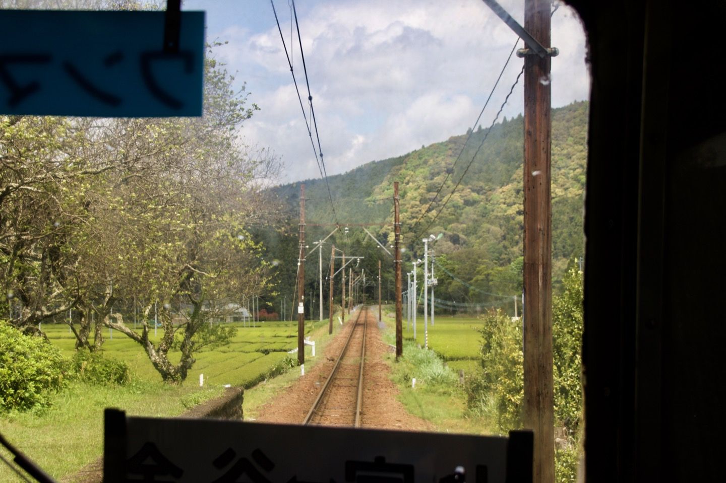 Die Strecke führt im weiteren Verlauf durch Teefelder der Region Kawane. Gleislage und Strommasten muten recht rustikal an.
