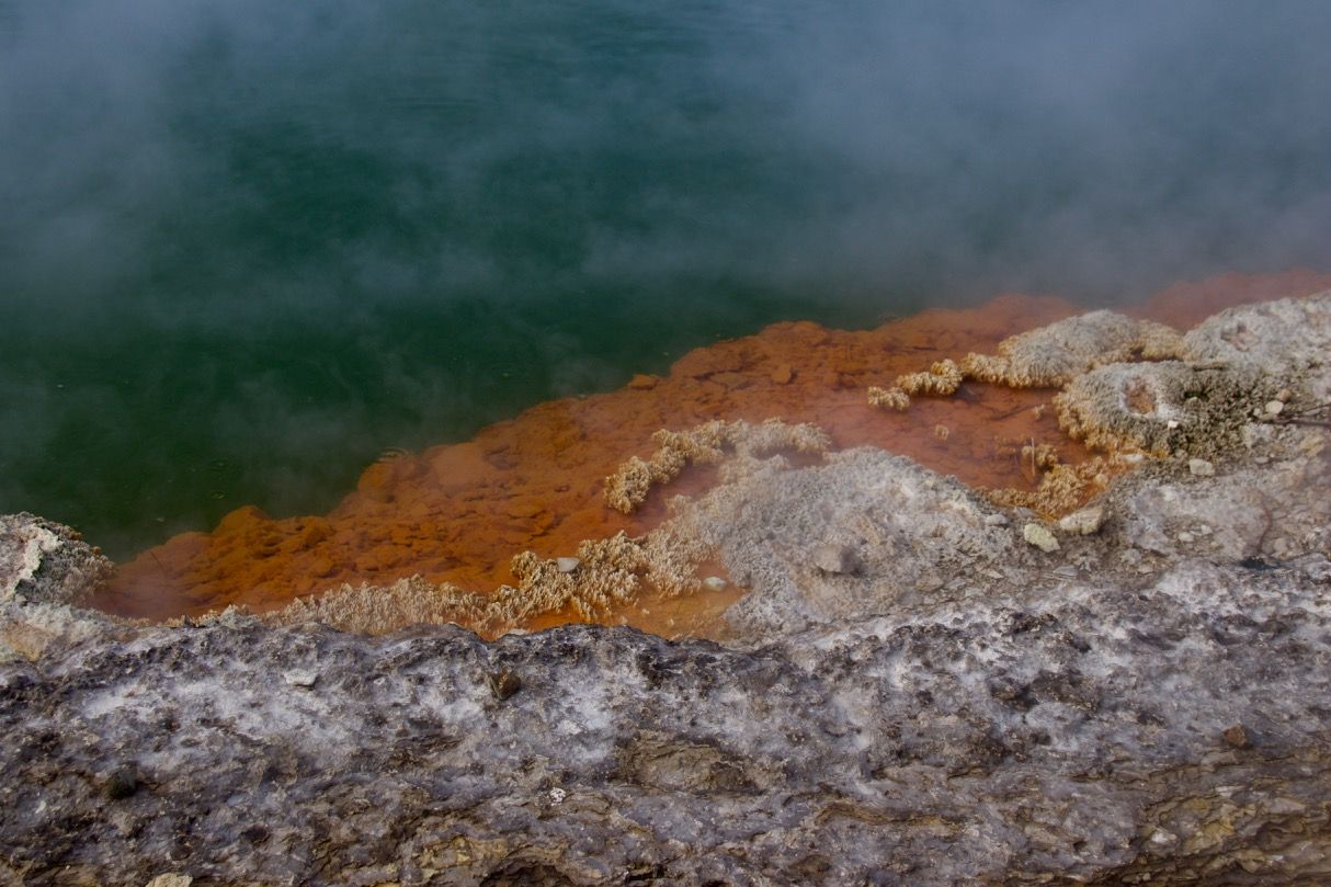 Wir wollten aber noch mehr Schwefel und sind deswegen beim zweiten Besuch erst mal nach Waiotapu gefahren. In der Maori-Sprache steht das ungefähr für „heiliges Wasser“. Dort wird man dann erst mal von einer Reihe von dampfenden Kratern begrüßt.
