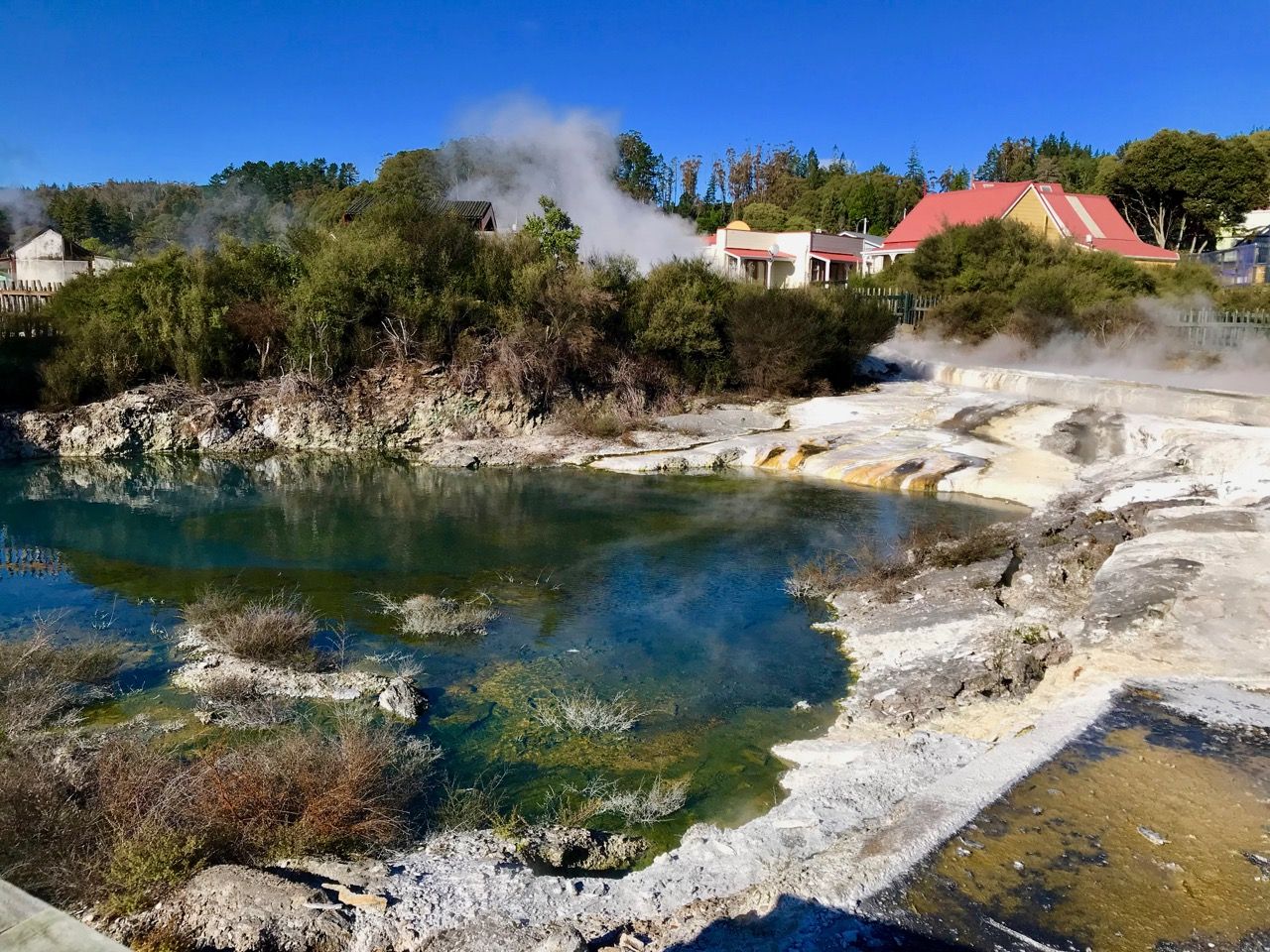 Der Zusatz „thermal village“ deutet schon darauf hin, dass es natürlich auch hier heiße Quellen gibt. Die Bewohner nutzen diese zum Kochen und zum Befüllen ihrer Außenbadewannen. Zum Kochen werden die Lebensmittel in einen dichten Behälter gepackt, in eine heiße Quelle herabgelassen und wenig später gegart wieder herausgeholt. Zum Baden wird das Wasser dagegen vorsichtig über kleine Kanäle aus Holz aus einem heißen See abgeleitet,.