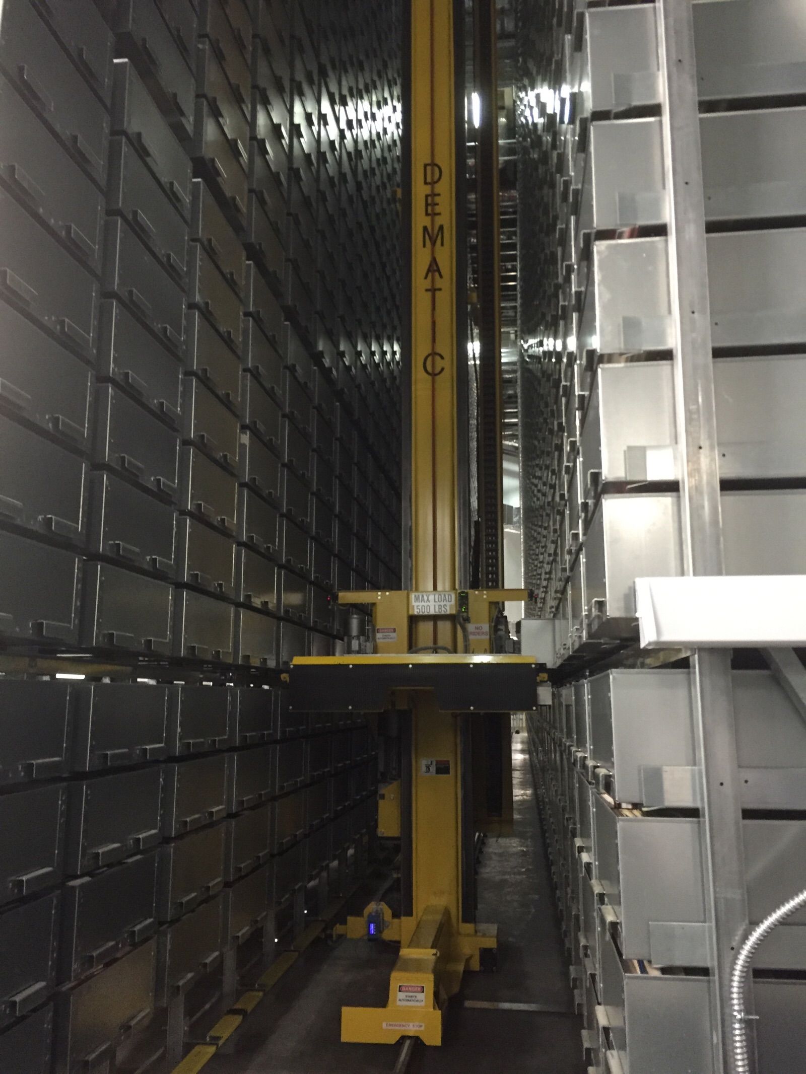 Unter der Kuppel ist das vollautomatisierte Lager, dass aus Metallkisten besteht, die mehrere Stockwerke tief unter die Erde ragen.