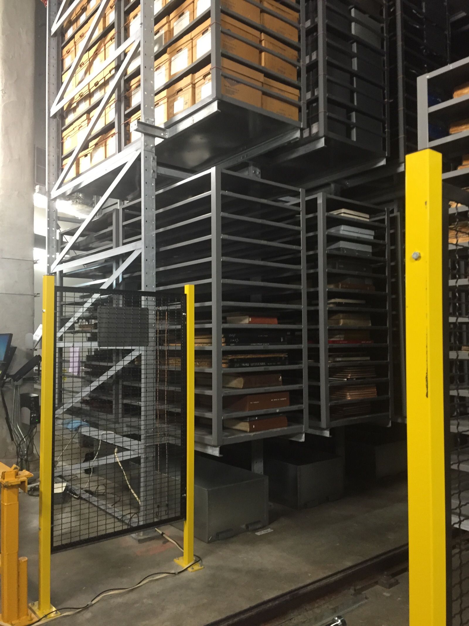 Auch für Archivmaterial und Übergrößen gibt es eine eigene Anlage. Hier bringt der Kran gleich das gesamte Regalelement (ca. 1.4m hoch) nach vorne, dass dann komplett so in die Bücherausgabe transportiert wird.